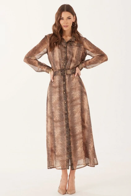Платье полуприлегающего силуэта из шифоновой ткани. Воротник на стойке рубашечного типа с застежкой по центру на петли и пуговицы. Рукав втачной длинный, по низу застежка на петлю и пуговицу. Платье отрезное на линии талии. По переду и спинке по низу лифа сборка. По переду от плеча кокетка и декоративные клапаны с пуговицами. По низу в боковом шве длинные разрезы. Платье частично на подкладке. В комплект входит съемный ремень. Обращаем ваше внимание, что фурнитура может незначительно отличаться от фото.