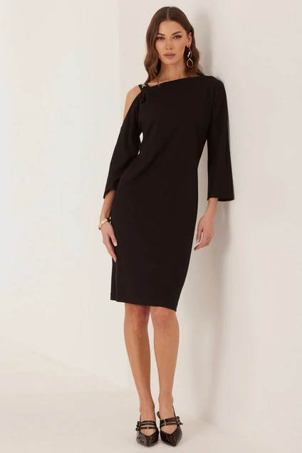 Платье полуприлегающего силуэта из трикотажного полотна. Горловина ассиметричная с фигурным вырезом на плече и бретелью с декором. Рукав цельнокроеный длиной 7/8 . На спинке талиевые вытачки, в среднем шве по низу разрез. Обращаем ваше внимание, что фурнитура может незначительно отличаться от фото. Длина изделия (44-48р - 96см)( 50-54р – 99см)