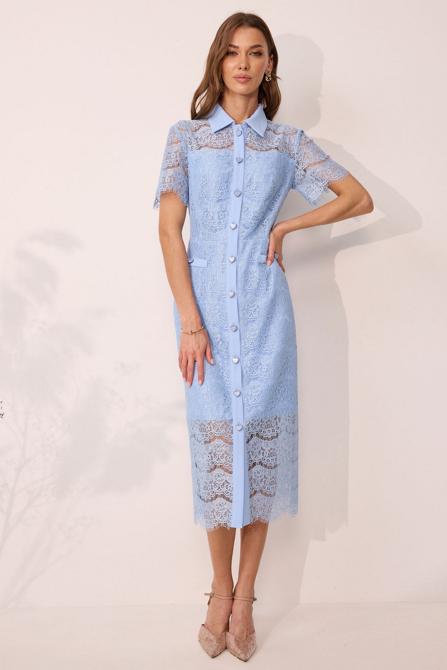 Платье полуприлегающего силуэта из кружева, комбинированного отделочной тканью. Воротник рубашечного типа с центральной застежкой на петли и пуговицы. Рукав втачной короткий. Платье отрезное по линии талии. По переду и спинке талиевые вытачки. Планки по переду, листочки и воротник из отделочной ткани. Платье на подкладке из отелочной ткани.Обращаем ваше внимание, что фурнитура может отличаться от фото. Длина платья: 119 см Длина рукава: 22 см