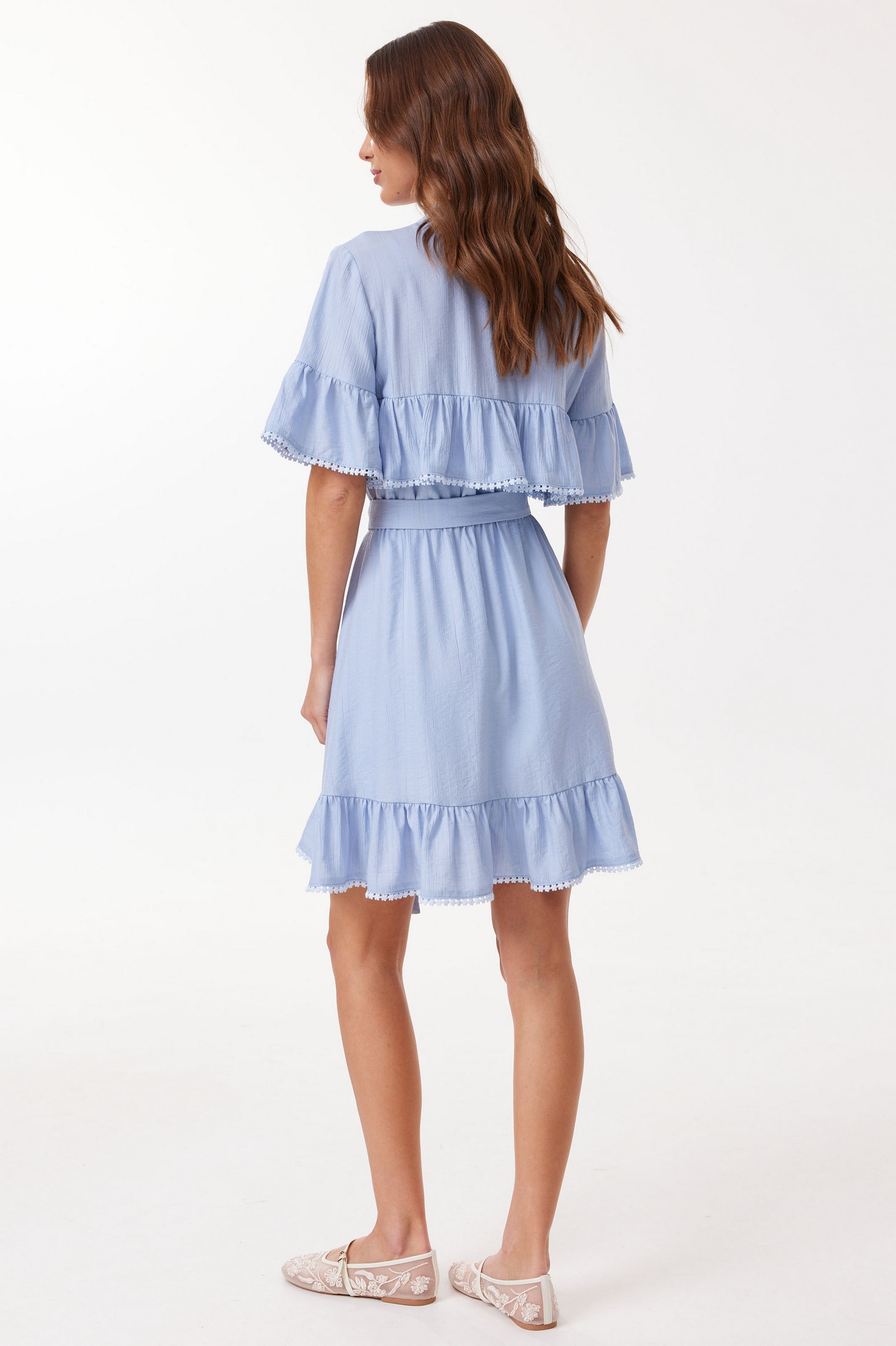 Платье полуприлегающего силуэта расширенное книзу из струящейся ткани. Платье отрезное по линии талии, в подрез вставлена эластичная тесьма (резинка). По верхней части переда подрез, с воланом на сборке. По нижней части юбки и рукава также волан со сборкой. В комплект входит съёмный пояс из основной ткани. Юбка в платье на подкладке. Обращаем ваше внимание, что фурнитура может отличаться от фото. Модель подойдет на рост 164-170 см. На этикетке будет указан рост 170 см Длина изделия: 96 см