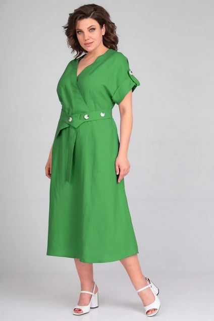 Эфектное летнее платье,полуприлегающего силуэта. Верхняя часть переда платья на запах, рукав цельнокроеный с притачным манжетом. По талии подрез. Юбка платья росклешеная, в боковых швах имеются карманы. К платью прилагается съёмный пояс из основной ткани с пуговицами.