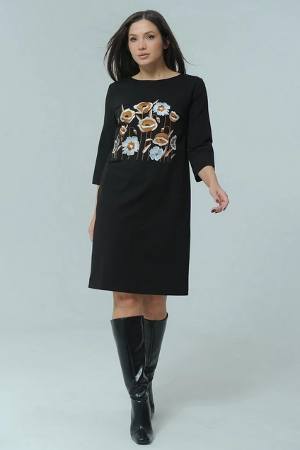 Перед цельный с нагрудными вытачками и с декоративной дизайнерской вышивкой "маки". Горловина округлой формы, обработана обтачкой. Спинка со средним швом, застёжка на навесную петлю и пуговицу по горловине. Снизу в среднем шве обработана шлица. Рукав одношовный втачной, длиной 3/4.