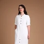 Платье-рубашка прямого силуэта с втачным рукавом и рубашечным воротником на стойке. Застежка по центру переда на петли-пуговицы. По переда накладные карманы и корманы в боковых швах. По спинке кокетка. По низу рукава притачная манжета.