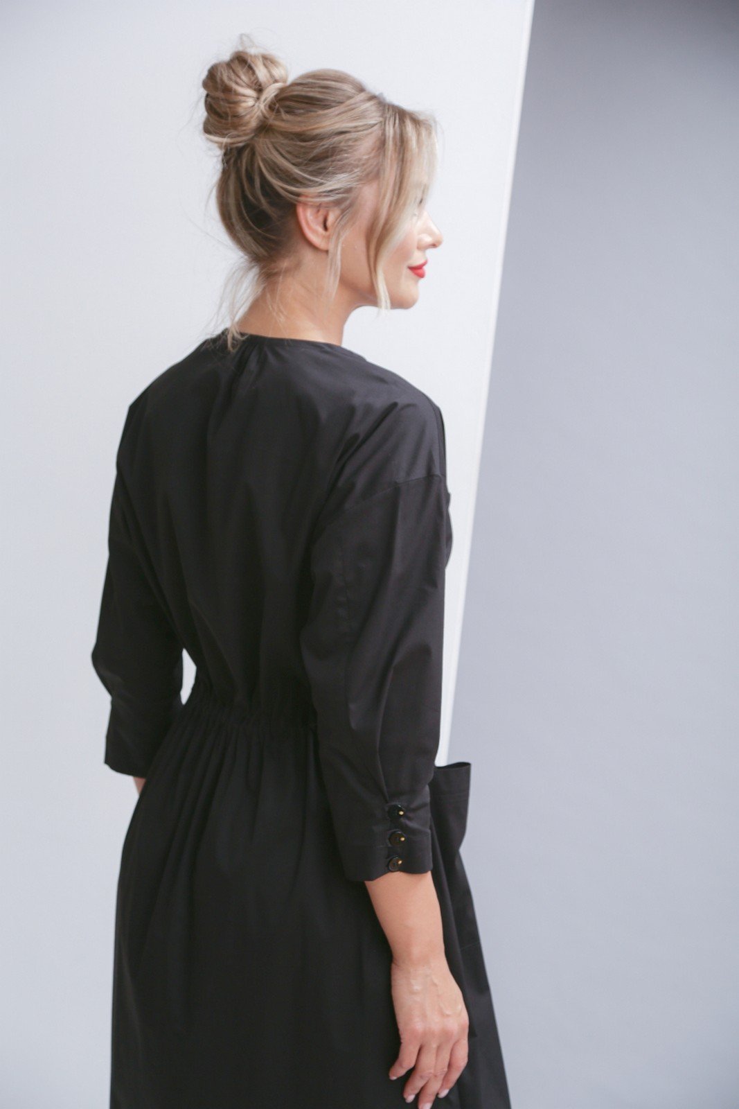 Элегантное черное платье-рубашка является настоящим воплощением утонченности и стиля. Оно создано из высококачественного материала, который идеально подходит как для офисных, так и для неформальных мероприятий. Платье имеет рукава длиной 3/4 с элегантными манжетами на пуговицах, что добавляет изысканности его дизайну. Накладные карманы на передней части не только практичны, но и придают изделию модный акцент. Особенностью данной модели является сквозная застежка на петли и пуговицы, которая обеспечивает легкость при надевании и создает аккуратный внешний вид. Талия с регулируемым шнуром, вставленным в кулису, позволяет подчеркнуть силуэт и обеспечивает комфортное прилегание. Длина платья 106 см по спинке делает его универсальным выбором для любой фигуры. Это платье – идеальный выбор для женщин, которые ценят элегантность и комфорт.