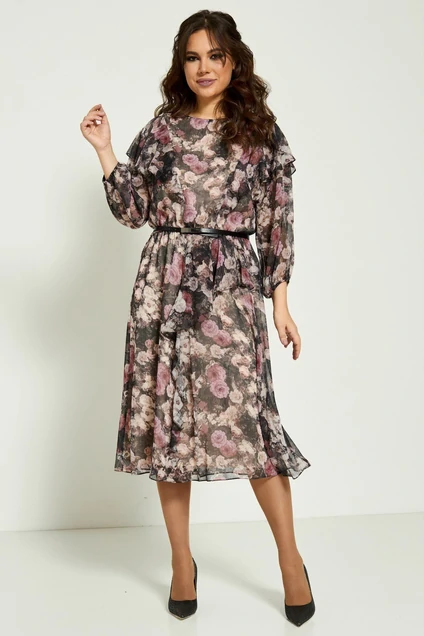 Элегантное шифоновое платье полуприлегающего силуэта, на подкладке, дополнено рюшами и валанами. Рукав спущен. Застежка-капелька по спинке на пуговицу. Талия отрезная, присборена на эластичную тесьму. Пояс в комплекте. Длина платья от плечевого шва 115см. Длина рукава 53см.