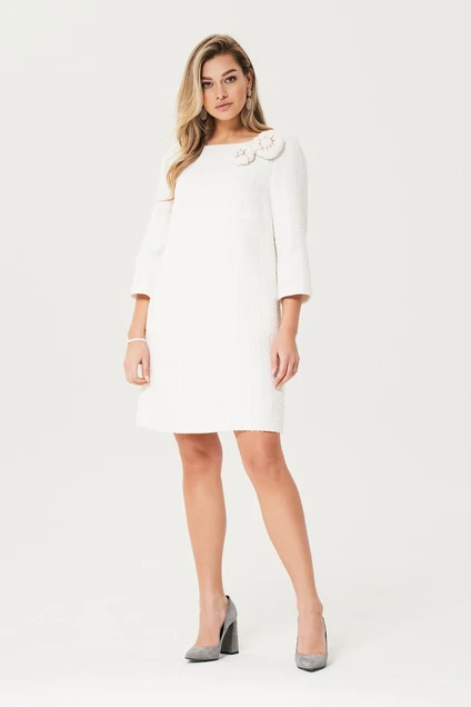 Стильное платье А-силуэта с втачным рукавом 3/4. Горловина округлой формы. По спинке застежка на металлическую молнию. Платье на подкладке. В боковых швах платья расположены функциональные карманы. Изюминку платью придает съемная брошь ручной работы ( в комплекте). Платье выполнено из фактурной ткани рогожка. На ткани платья в красном цвете присутствует напыление с легким блеском, что придает неповторимый шарм данному платью. Длина платья от плечевого шва 93см. Длина рукава 47см.