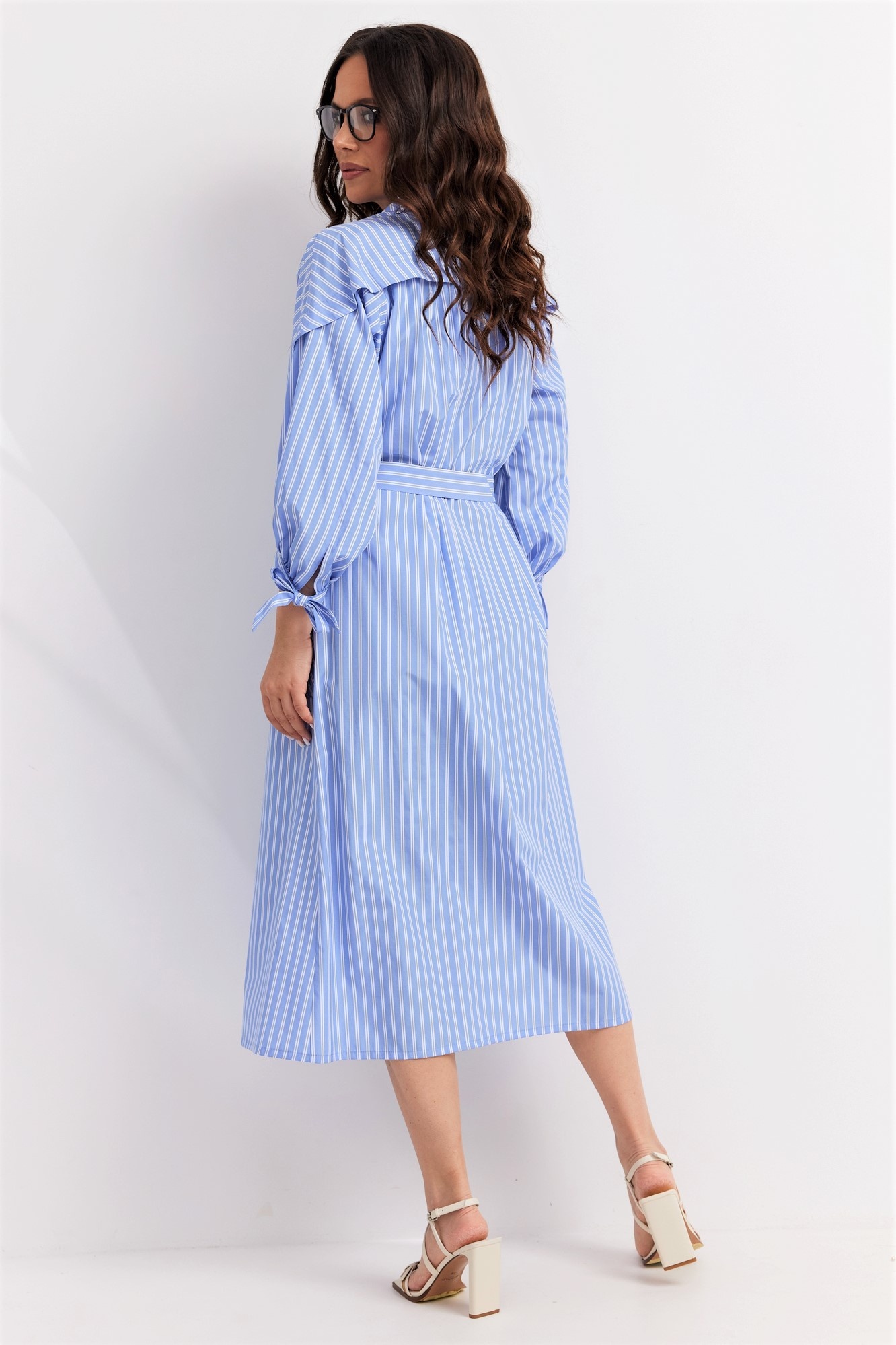 Платье 2720 голубой Магия Моды сочетает стиль и комфорт. Коллекция бренда Магия Моды предлагает легкое платье из натурального хлопка с добавлением нейлона и спандекса, обеспечивающего легкость и прочность ткани. Свободный силуэт с двубортной застежкой на кнопки подчеркивается съемным поясом из основной ткани, позволяющим регулировать посадку по фигуре. Отложной воротник и рукава со спущенной линией плеча завершаются манжетами с завязками, придавая платью непринужденность. Голубой цвет в полоску делает платье идеальным выбором для весенне-летнего сезона, а длина миди (118 см от плечевого шва) и длина рукава 42 см обеспечивают комфорт в повседневной носке. Этот наряд идеален на каждый день и для деловых мероприятий.