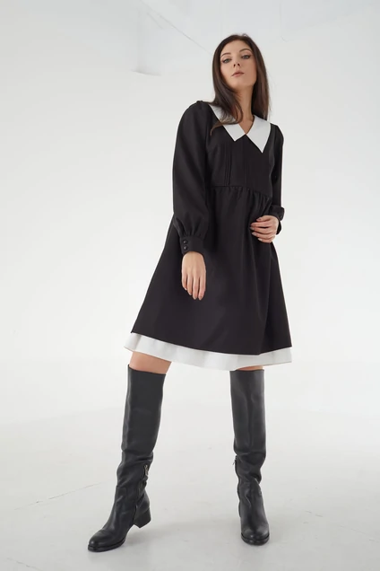 Платье трапециевидного силуэта, длиной до колена. Нижняя часть платья выполнена на подкладке (хлопок) со сборкой по низу в виде притачного волана. Перед с горизонтальным подрезом. Лиф с нагрудными вытачками и декоративными защипами. Нижняя часть переда со сборкой от подреза. Спинка со средним швом, разрезом-капелькой и застёжкой на одну воздушную петлю-пуговицу. Рукав втачной, расширенный, со сборкой по окату и низу. Низ рукава на притачной манжете. Горловина V-образная, оформлена плосколежащим воротником. Воротник выполнен из отделочной ткани.