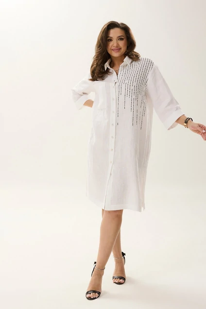 Платье-рубашка прямого силуэта с застежкой на пуговицы. По левой полочке и спинке принт контрастного цвета, по правой полочке - накладной нагрудный карман. В боковых швах карманы, по низу - разрезы. Рукав втачной с отворотом по низу, длина 7/8