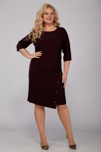 Платье женское полуприлегающего силуэта, с втачными одношовными рукавами. По низу рукавов фигурная притачная деталь. Перед цельный, с нагрудными вытачками, выходящими из бокового шва. В области плечевых швов притачная деталь, имитирующая погон, украшенная пуговицами. Горловина округлая. По низу переда с одной стороны оформлен рельеф с пуговицами. Спинка со средним швом, шлицей, и талиевыми вытачками. Застежка-молния потайная в среднем шве спинки.