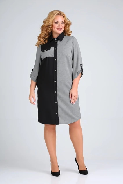Платье женское полуприлегающего силуэта с втачными одношовными рукавами. Для регулировки длины рукава имеется пата с пуговицей. Перед с нагрудными вытачками, выходящими из бокового шва. Воротник рубашечного типа на притачной стойке. Застежка центральная, на притачной планке с петлями и пуговицами. Одна часть переда отрезная по линии выше груди, с клапаном в шве притачивания. Спинка со средним швом. Низ изделия округлый.