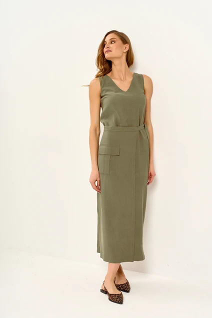 Платье 1014 хаки от Mar.s design сочетает в себе стиль и комфорт. Коллекция бренда привлекает простотой и утонченностью. Изготовлено из вискозы и льна, материал обеспечивает легкость и дышимость, что делает его идеальным выбором для теплой погоды или межсезонья. Прямой крой и V-образный вырез спереди подчеркивают силуэт, а разрез сзади добавляет свободы движений. Отсутствие рукавов подходит для жарких дней, а наличие боковых карманов повышает практичность. Фартух с поясом и накладным карманом на клапане добавляет оригинальности. Платье подходит для повседневных образов, отдыха и прогулок. Хаки цвет универсален и легко комбинируется с другими элементами гардероба.