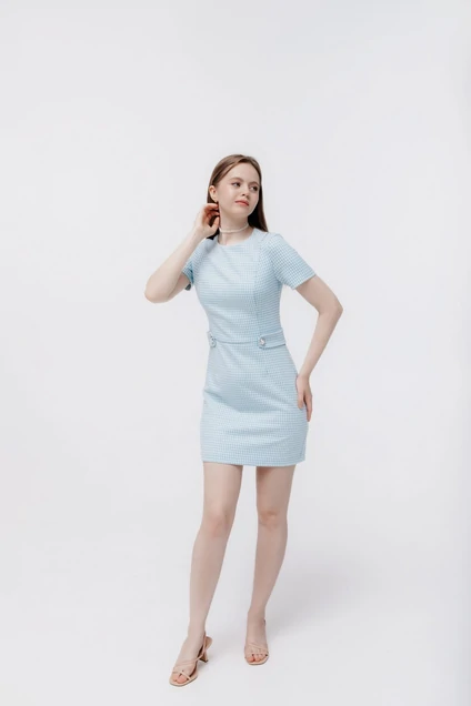 Платье полуприлегающего силуэта с подкладкой до линии талии и длиной выше уровня колена. Перед и спинка с рельефами с плечевого шва и горизонтальным подрезом по линии талии. Рукав втачной, одношовный, короткий. Круглый вырез горловины обработан подкладкой. В среднем шве спинки застежка на тесьму-молнию (потайную). Низ платья и рукавов подогнут. По линии талии рлатье декорировано патами и пуговицами.
