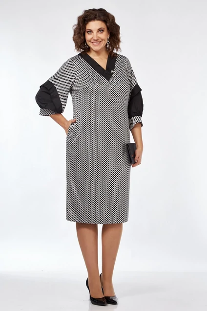 Платье женское прямого силуэта, из трикотажного полотна с отделкой из однотона. Перед платья с нагрудными вытачками из боковых швов, V-образным вырезом горловины, обработанным декоративными планками из отделочной ткани, на планки нашит декоративный элемент. Спинка со средним швом и шлицей на движение в нем. Рукав втачной одношовный, на манжете, с отрезной деталью по низу и декоративной рюшей.