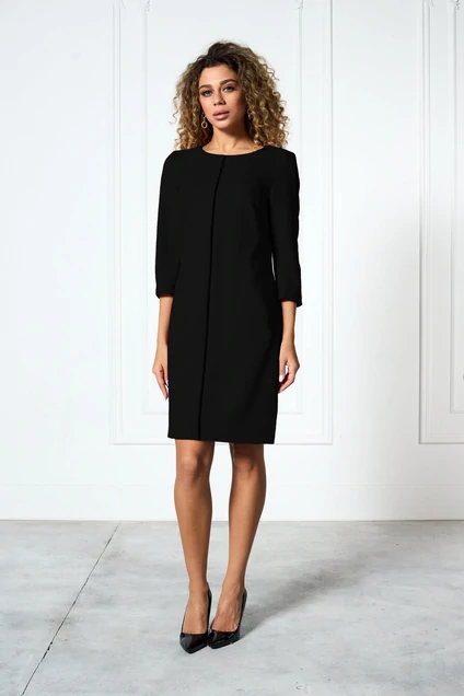 Платье полуприлегающего силуэта, спинка разрезная с талевыми вытачками и застежкой на тесьму «молния», внизу разрез. Перед и рукава разрезные по центру с втачным кантом. Низ рукава и платья на подгибке с отделочной строчкой.
