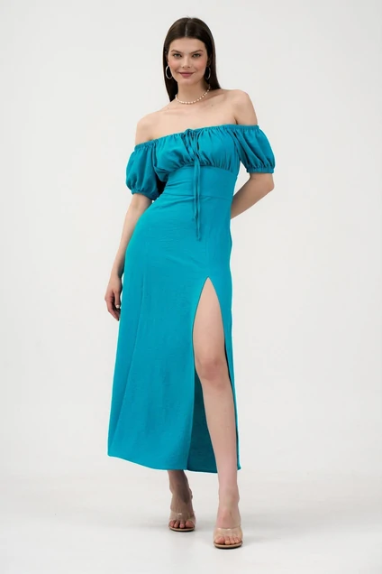 Платье летнее длинное с разрезом, с открытыми плечами для повседневной носки.