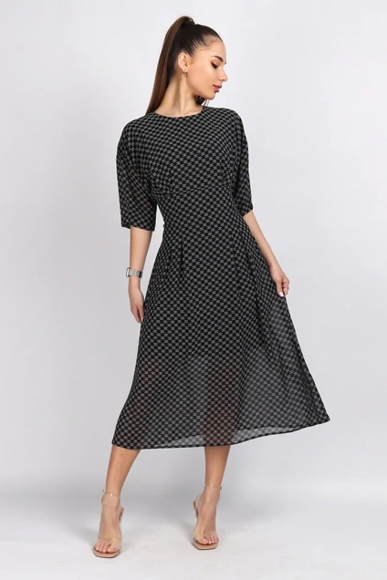 Платье женское отрезное под линией груди.На верхней части платья от линии подреза заложены складки.На нижней части (юбка) складки застрочены от линии подреза ,что придает красивое облегание по фигуре.Линия плеча спущена .Рукав притачной со складкой по низу.По спинке застежка на потайную тесьму молния до линии талии.Длина изделия (по среднему шву)116 см, длина рукава 25 см.Изделие изготовлено из плательной ткани.