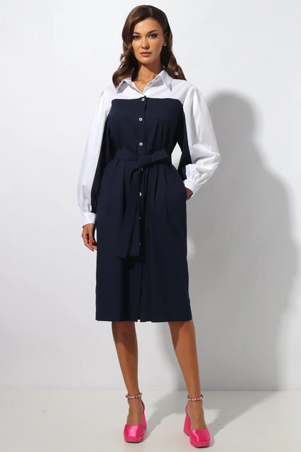 Платье женское( комбинированное из двух цветов ткани) прямого силуэта с цельнокроеным рукавом.Низ рукава обработан манжетой с застежкой на петлю и пуговицу.Горловина обработана отложным воротником на отрезной стойке.На полочке застёжка на петли и пуговицы.По линии талии завязывающийся пояс.Длина изделия 108 см. Длина рукава 62см. Подойдет на рост 164-170 см. Цвет основной ткани: темнно-синий.
