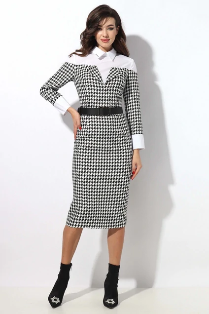 Платье женское полуприлегающего силуэта отрезное по линии талии.Верхняя часть платья имитация блузки из хлопчатобумажной ткани.Воротник отложной на отрезной стойке .С правой стороны на воротнике термоаппликация. На полочке запах с отложными лацканами.На спинке потайная молния(50 см), по низу платья разрез.Рукав втачной.Низ рукава на притачной манжете.По линии талии широкий ремень(входит в комплект).Длина платья 112 см.Длина рукава 57 см.Тип ткани жаккард "гусиная лапка".Изделие подойдет на рост 164-170 см.