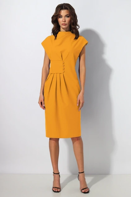Платье женское полуприлегающего силуэта с подрезом с правой стороны по линии талии.На талии имитация пояса с декоративными пуговицами и односторонними складками, заложенными к центру.По горловине цельнокроеная стойка с мягкой складкой от плечевого шва.Линия плеча спущена.По спинке застёжка на потайную тесьму молния до линии талии.Длина изделия 103 см. Ширина плеча от горловины 23 см .Подойдет на рост 164-170 см. Цвет:жёлто-оранжевый.