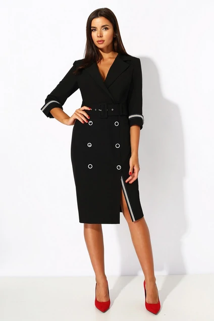 Платье женское полуприлегающего силуэта отрезное по линии талии. Верхняя часть платья с запахом. Воротник пиджачного типа с отложными бортами.Нижняя часть платья с рельефами до низа.С левой стороны шлица с отделочной тесьмой.По центру декоративные пуговицы.Спинка со средним швом и застёжкой на потайную тесьму молния. По линии талии отделочный пояс с пряжкой и блочками,что позволяет регулировать размер талии.Рукав втачной 3/4,с отложной манжетой.По верхнему шву манжеты отделочная тесьма.Длина изделия (по среднему шву)104 см, длина рукава 44 см. Подойдет на рост 164-170 см.Цвет: черный.