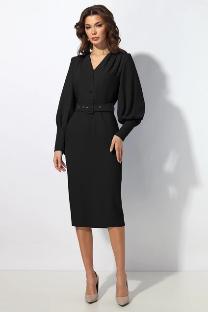 Платье женское полуприлегающего силуэта отрезное по линии талии.На полочке от плечевого шва сборка.Застежка на две петли и пуговицы.По линии талии ремень с пряжкой.Рукав втачной с широкой манжетой и застёжкой на четыре петли и пуговицы.В левом боковом шве застёжка на потайную тесьму молния.Длина изделия 116 см. Длина рукава 62 см. Подойдет на рост 164-170 см. Цвет:черный.