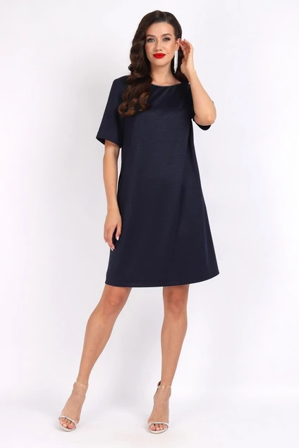 Платье прямого силуэта с декоративным кантом со стразами по горловине,переходящий в завязывающийся бант на спинке.По спинке V образный вырез.Платье без подкладки.Длина рукава 27 см, длина изделия по спинке от плечевого шва 94 см.Изделие изготовлено из плательной ткани.Подойдет на рост 164-170 см. Цвет:темно-синий.