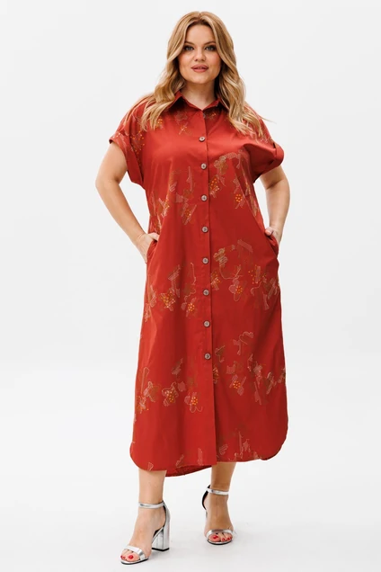 Платье рубашечного типа, свободного кроя - выполнено из приятной на ощупь хлопковой ткани с пайетками. Универсальность кроя и легкая ткань сделают его любимым изделием Вашего гардероба в летний сезон. По переду застегивается на пуговицы, снизу сбоку разрез, по спинке длиннее. Рукав короткий цельнокроеный приспущенный на отложенной манжете. Благодаря встречной складке на спинке имеет небольшое клешение. Длина изделия по спинке от горловины 130 (+/-1) см. Изделие подойдет на рост 170 см.