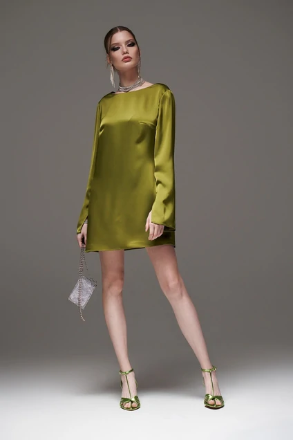 Платье полуприлегающего силуэта, из плотного атласного искусственного шелка. V-образный вырез на спине. Рукав расширен к низ, с разрезом. Длина - 38 см от талии до низа