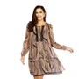 Платье женское свободного силуэта. Округлый вырез горловины, на завязках. Рукав втачной, со сборкой, по низу-на резинке. Изделие с подрезами, со сборкой. По спинке-декоративный вырез с кружевом. Нижний валан платье выполнен из сетки с кружевом. Подкладкой служит-нижнее платье на регулируемых бретелях. Длина по спинке-93см, длина рукава-63см