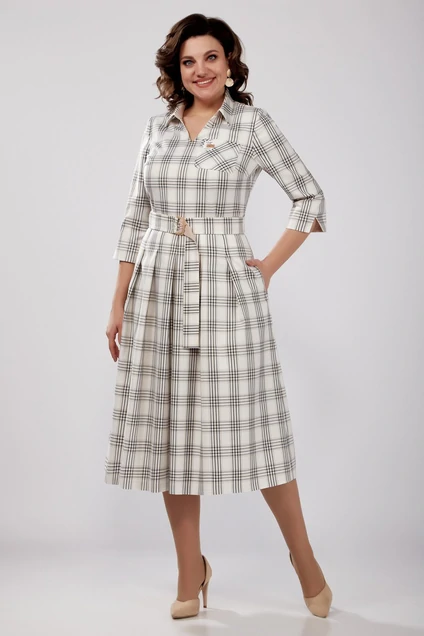 Платье женской полуприлегающего силуэта, отрезное по линии талии, с односторонними складками. Деталь переда с нагрудной вытачкой и одним накладным карманом, оформленным декоративным элементом. Деталь спинки платья со средним швом и талиевыми вытачками. Воротник рубашечного типа, стойка которого выполнена из ткани компаньона. Рукав втачной, одношовный, с декоративным разрезом и обтачкой из декоративной ткани. Пояс съёмный. В боковых швах-карманы, застёжка на тесьму-молнию. Длина по спинке-118см, длина рукава-46см