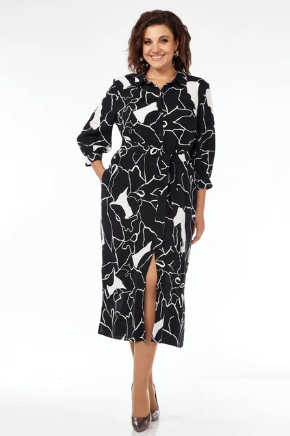 Платье-рубашка прямого силуэта с застежкой на петли и пуговицы, длиной миди. По переду-нагрудная вытачка. Воротник -рубашечный. Рукав втачной со сборкой и манжетой по низу. В боковых швах-карманы и разрезы по низу. В качестве дополнения -пояс.