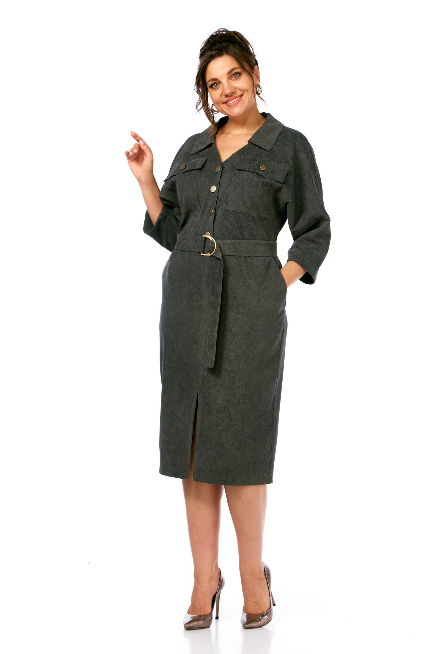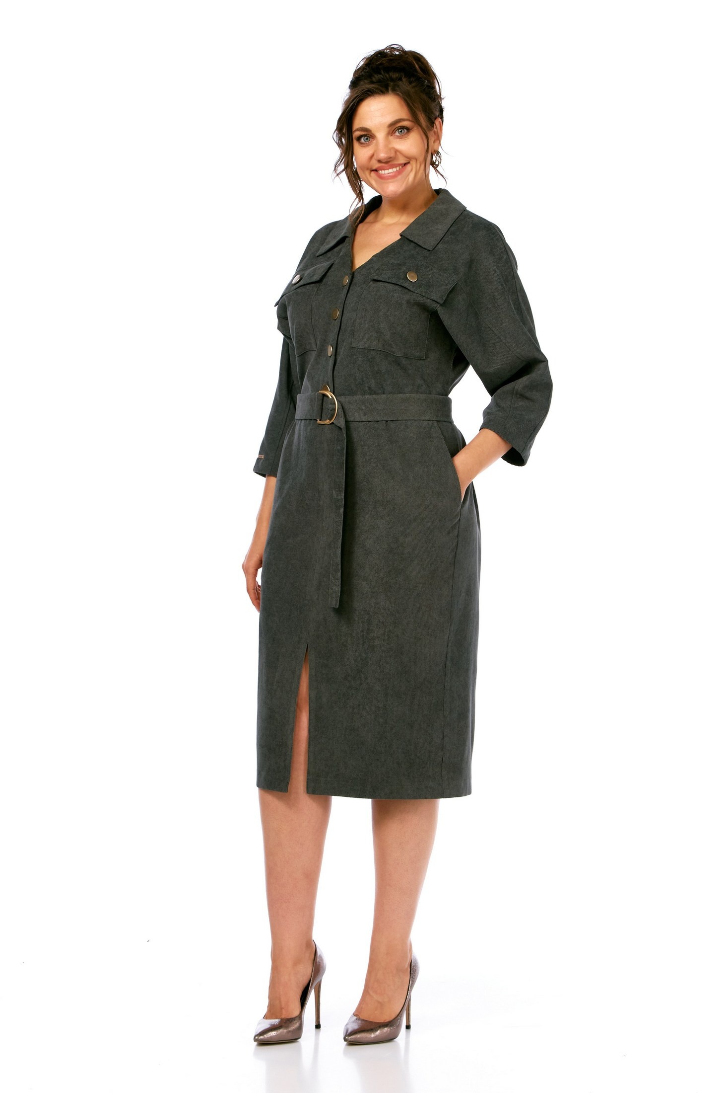 Платье женское полуприлегающего силуэта, без подкладки, отрезное по линии талии. Имеет V-образный вырез, отложной воротник и цельнокроеный рукав. На полочке до талии обработана застежка на петли и пуговицы, отрезная кокетка спереди переходит в рукав до его низа, на правом рукаве внизу имеется пришивной декоративный элемент. На груди – накладные карманы с клапаном застегиваются на петлю и пуговицу. Юбка платья слегка заужена к низу, имеет карманы-хулиганы и шов спереди, в котором обработан разрез для удобства ходьбы.