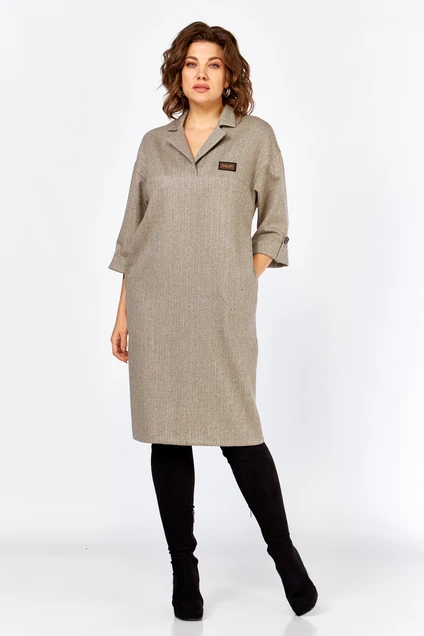 Платье полуприлегающего силуэта, длины миди, без подкладки. На полочке обработана отрезная кокетка, воротник отложной, пиджачного типа. Плечи изделия приспущены, рукава укорочены и заканчиваются манжетой, по низу пришит декоративный элемент (в виде паты), свободный край которого закреплен к рукаву пуговицей. Слева на груди – декоративный пришивной элемент (нашивка). По спинке шов, который заканчивается шлицей, для удобства при ходьбе. В боковых швах обработаны карманы-хулиганы. Длина по спинке - 101 см, длина рукава от горловины - 63 см