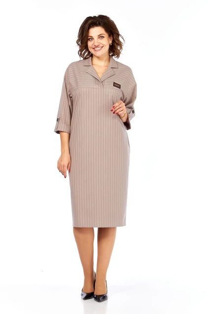 Платье полуприлегающего силуэта, длины миди, без подкладки. На полочке обработана отрезная кокетка, воротник отложной, пиджачного типа. Плечи изделия приспущены, рукава укорочены и заканчиваются манжетой, по низу пришит декоративный элемент (в виде паты), свободный край которого закреплен к рукаву пуговицей. Слева на груди – декоративный пришивной элемент (нашивка). По спинке шов, который заканчивается шлицей, для удобства при ходьбе. В боковых швах обработаны карманы-хулиганы. Длина по спинке - 101 см, длина рукава от горловины - 63 см