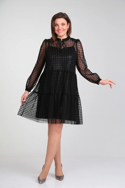 Платье женское свободного силуэта с двумя валанами на сборке. Горловина обработана рюшей с завязками. Рукав втачной, со сборкой, на резинке внизу. Подкладкой служит нижнее платье на регулируемых бретелях. Длина по спинке-97см; длина рукава-62см