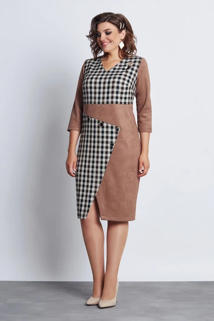 Повседневное женское платье полу-прилегающего силуэта, выполнено из текстиля в клетку и замши. Горловина платья V-образной формы, на обтачке. По переду выполнены ассиметричные подрезы с вставкой из замши и декорированы пуговицами. Рукав втачной, оптимальной длины, выполнен из замши. Спинка выполнена из замши, со средним швом и вытачками, в среднем шве потайная молния. Стильное женское платье с красивой брошью прекрасно подойдет для повседневного ношения! Длина 103 см. в 52р. Ширина груди- 53см, Ширина талии -47см, Ширина бедер- 56см, длина рукава- 47см, ширина рукава 19см