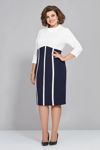 Трикотажное платье, полуприлегающего силуэта, выполнено из трикотажа (хорошо тянется). Горловина платья округлой формы, обработана притачной стойкой, из светлого трикотажа. Лиф платья отрезной выше линии талии, выполнен из светлого трикотажа. Нижняя часть платья выполнена из синего трикотажного полотна, с вставками из светлого. Рукав втачной, оптимальной длины, выполнен из светлого трикотажа. Спинка идентична полочке, также отрезная по верху, с светлым однотоном по лифу и темной юбкой. Простое, но универсальное и удобное платье отлично подойдет для прохладных осенних дней! Длина 102 см. в 52р. Ширина груди- 52см, Ширина талии -46см, Ширина бедер- 56см, длина рукава- 46см., ширина рукава 18,5см