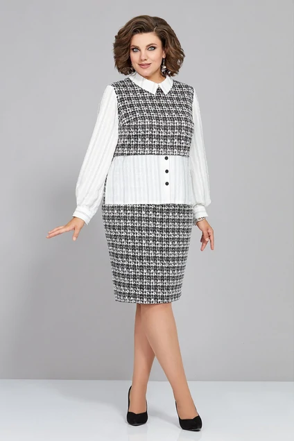 Стильное женское платье полу-прилегающего силуэта, выполнено из трикотажного полотна и шифона с принтом. Горловина платья обработана воротником на стойке, сзади застежка на пуговицу. Лиф платья выполнен из трикотажа с принтом, по низу лифа имитация блузы из шифона с застежкой на петли-пуговицы. Юбка платья выполнена из трикотажа, немного заужена к низу. Рукав втачной, выполнен из шифона, по низу присборен на манжет. Спинка идентична полочке, лиф выполнен из трикотажа, также как и юбка, по низу лифа шифон с разрезами по боковым. Стильное платье отличный выбор для офиса и учреждений образования. Длина 104 см.в 52р. Ширина груди- 52см, Ширина талии -50см, Ширина бедер- 57см, длина рукава- 60см., ширина рукава 19,5см