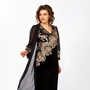 Нарядное женское платье полу-прилегающего силуэта, выполнено из эластичной ткани с принтом и расшитой пайетками ( на трикотажной подкладке), в сочетании с однотонным велюром. На полочке выполнен V-образный вырез горловины, лиф платья выполнен из принтованной, эластичной ткани расшитой пайетками (на трикотажной подкладке), по линии талии отрезной. Юбка платья выполнена из эластичной ткани с принтом, расшитая пайетками (на подкладке), по линии талии декорирована съемным поясом из велюра, с яркой пряжкой со стразами. Спинка выполнена из велюра, со средним швом и вытачками. Рукав втачной, оптимальной длины выполнен из эластичной ткани с принтом, расшитая пайетками. Эффектное платье из изящной ткани прекрасный выбор для любого торжественного мероприятия! Длина 117 см. в 52р. Ширина груди- 52см, Ширина талии -47см, Ширина бедер- 56см, длина рукава- 47см, ширина рукава 19см.