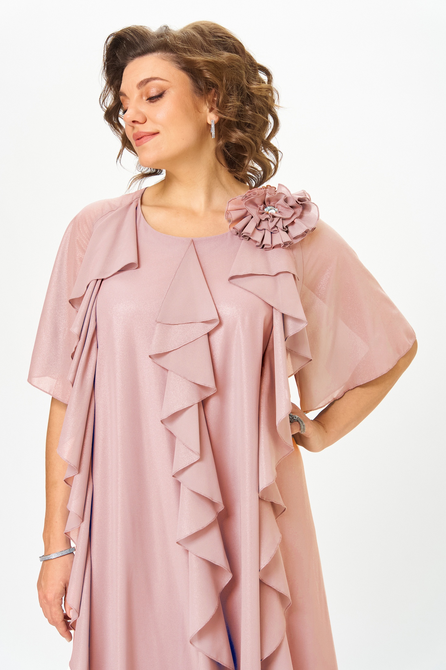 Эффектное платье для обладательниц роскошных форм, свободного покроя, выполнено из шифона, на трикотажной подкладке. Горловина платья округлой формы, на обтачке, на переднем полотнище выполнены вертикальные подрезы с воланами. Спинка со средним швом, рукав покроя реглан, расклешенного покроя, по горловине декор в виде съемного цветка. Легкое, нарядное платье отличный вариант для любительниц комфортных и изящных нарядов!