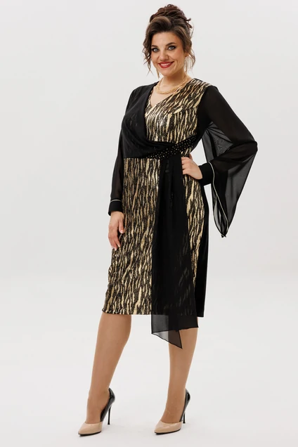 Элегантное женское платье полу-прилегающего силуэта, выполнено из трикотажного полотна, велюра и шифона. Горловина платья V-образная, обтачена подкладкой, по линии талии отрезное с вставкой из велюра по одной стороне и декорирована стразами. На лифе выполнена отлетная деталь из шифона по одной стороне, которая плавно переходит в отлетной шлейф на юбке. Спинка платья выполнена из однотонного велюра, со средним швом и вытачками, полочка на трикотажной подкладке. Рукав втачной, длинный, выполнен из шифона, расклишается к низу. Низ рукава декорирован кантом и притачной манжетой из шифона, с застежкой на петлю-пуговицу. Эффектное платье с необычным декором сделает ваш образ самым ярким на любом мероприятии! Длина 107 см. в 52р. Ширина груди- 53см, Ширина талии -47см, Ширина бедер- 57см, длина рукава- 60см, ширина рукава 23см.