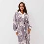 Элегантное женское платье из нежного шифона, представленное в черном цвете с изящным белым принтом в виде листвы, идеально подчеркнет ваш стиль. Платье обладает свободным силуэтом, расклешенным к низу, и отличается оригинальной отрезной линией по талии с эффектной резинкой «венгерка» и декоративными рюшами. В-образная горловина дополнена мелкими рюшами, идущими вдоль переда до талии, завязывающимися на элегантные шнурки. Рукава на одном шве, втачные, завершаются аналогичной резинкой-венгеркой, добавляя изысканности образу. Платье оснащено тонкой трикотажной подкладкой для комфорта и лучшей посадки. Передняя часть украшена дополнительными рюшами, что придает модели особый шарм и женственность. Это платье станет прекрасным выбором для торжественных мероприятий или элегантных вечерних выходов.