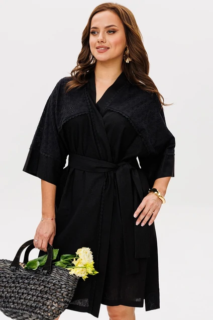 Платье –кимоно женское, свободного облегания с цельнокроеным рукавом комбинированное из двух различных по фактуре тканей. По переду притачная планка. В боковых швах функциональные карманы. Платье без застёжки с фиксирующей завязкой и поясом. Платье задекорировано кружевом.
