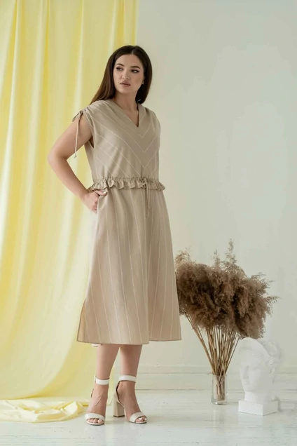 Платье женское свободного силуэта выполнено из плательной летней ткани. Плечи спущены и собираются на кулису. По линии талии кулиса и притачной волан. В боковых швах карманы и заканчиваются они небольшими разрезами. Горловина V-образная. Платье без подкладки.