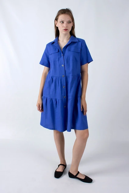Платье отрезное по лини талии, два волана. Декоративные рельефы по переду и спинке. Кокетки. Накладные карманы. Отложной воротник. Застёжка планка на пуговицах. Длина изделия: 100 см