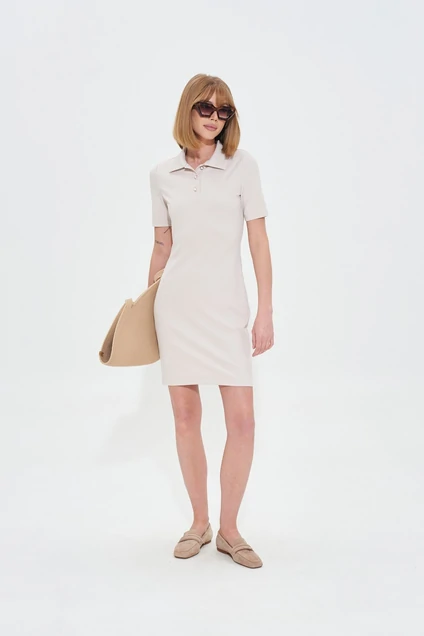 Платье облегающего силуэта из мягкого трикотажного полотна. Воротник поло. На планке пуговицы в виде цветка.