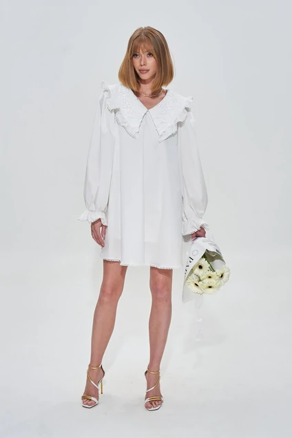 Платье свободного силуэта с воротником из ажурного шитья. Отделка декоративной тесьмой. Платье на подкладке.