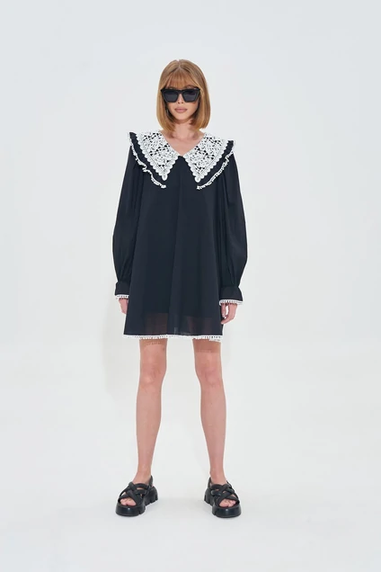 Платье свободного силуэта с воротником из ажурного шитья. Отделка декоративной тесьмой. Платье на подкладке.