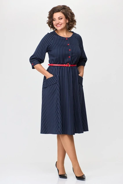Платье женское полуприлегающего силуэта, расширенное к низу, без подкладки. Перед и спинка отрезные по линии талии, шов присобран на эластичную тесьму. Верхняя часть переда с центрально бортовой застежкой на петли и пуговицы, нижняя часть юбки переда состоит из 3 клиньев, боковая часть юбки переда разрезная, в шве карман с клапаном. Верхняя часть спинки не разрезная, нижняя часть спинки со средним швом. По боковым швам, на уровне линии талии пришиты шлевки для пояса. Рукав реглан с вытачкой от горловины, по низу обработан разрез и сборка, с притачной манжетой застегивающиеся на петлю и пуговицу. Головина и борт верхней части переда обработаны подбортом, горловина спинки обработана обтачкой.